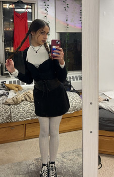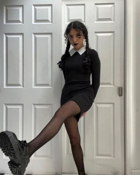 Opt for a black dress, style your hair in two braids, and add a touch of darkness with pale makeup and black lipstick for a spooky chic vibe.